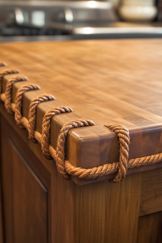 Want to add an artisanal, handcrafted touch to your rustic kitchen? Rope or leather straps along the edges of your butcher block counter can create an eye-catching detail. It’s a simple way to introduce texture and a sense of craftsmanship. Looking for a unique design element that also enhances durability? This idea fits the bill.