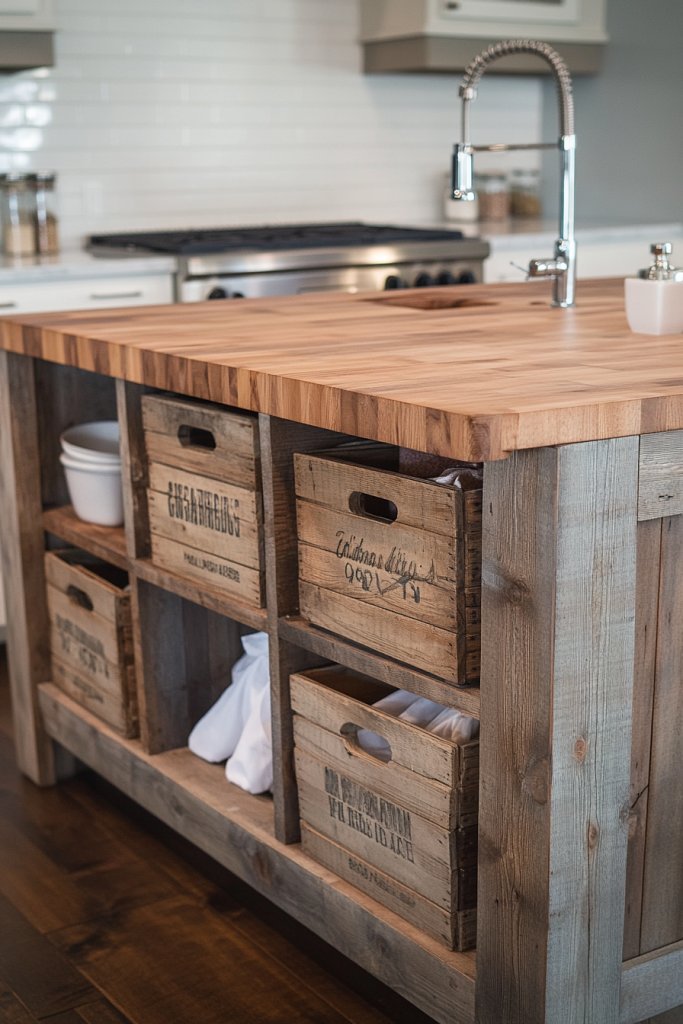 Need extra storage without sacrificing style? Open crates under your butcher block or island offer a practical solution that adds rustic charm. It’s a smart way to organize tools, linens, or pantry items while keeping everything accessible. Want to combine function with a vintage vibe? This idea ticks all the boxes.