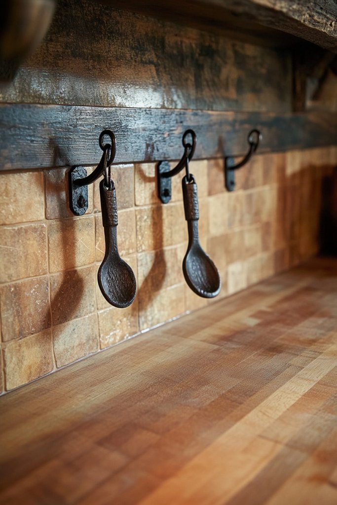 Imagine a row of heavy-duty cast iron hooks mounted along the side of your open shelving or beneath a wooden beam. They hold everything from spatulas to oven mitts, all within easy reach. The dark, textured metal contrasts beautifully with warm wood tones, creating a nostalgic, farmhouse vibe. The hooks age gracefully, developing a patina that enhances their character over time.
