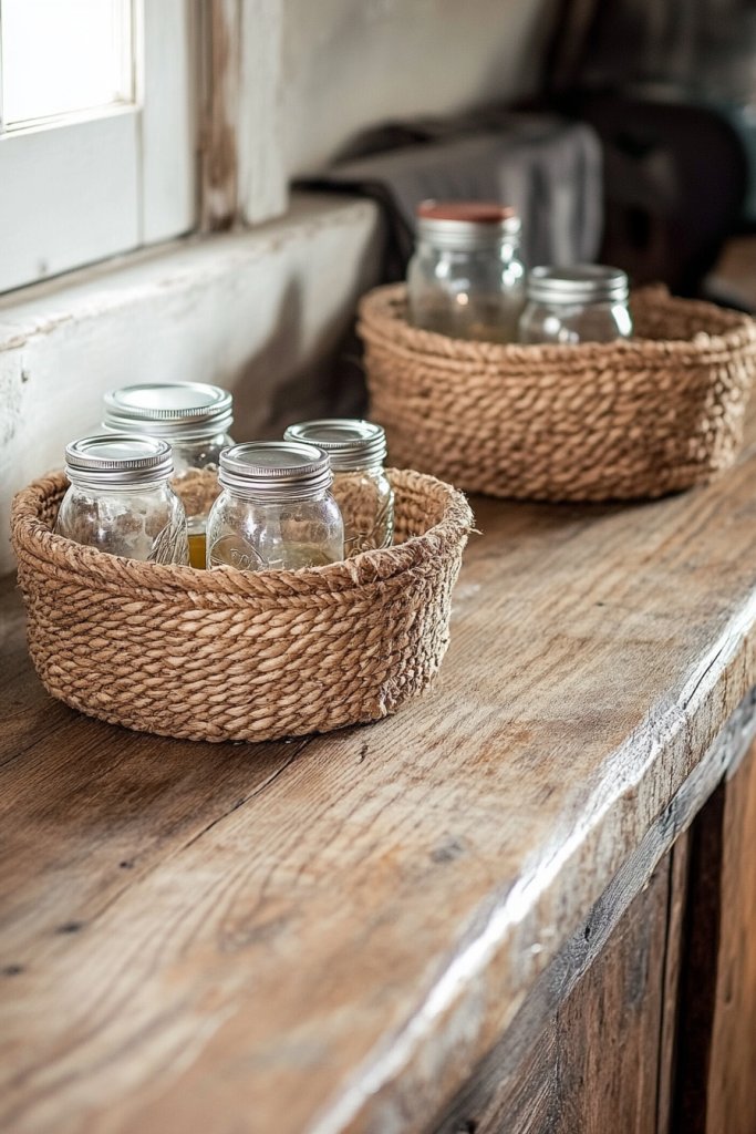 Cluttered countertops can kill the rustic vibe faster than you can say ‘Mess.’ Woven baskets and mason jars offer a charming, practical way to organize essentials while adding texture and warmth. They’re versatile, affordable, and instantly upgrade the look of your kitchen. Plus, who doesn’t love a bit of vintage charm?