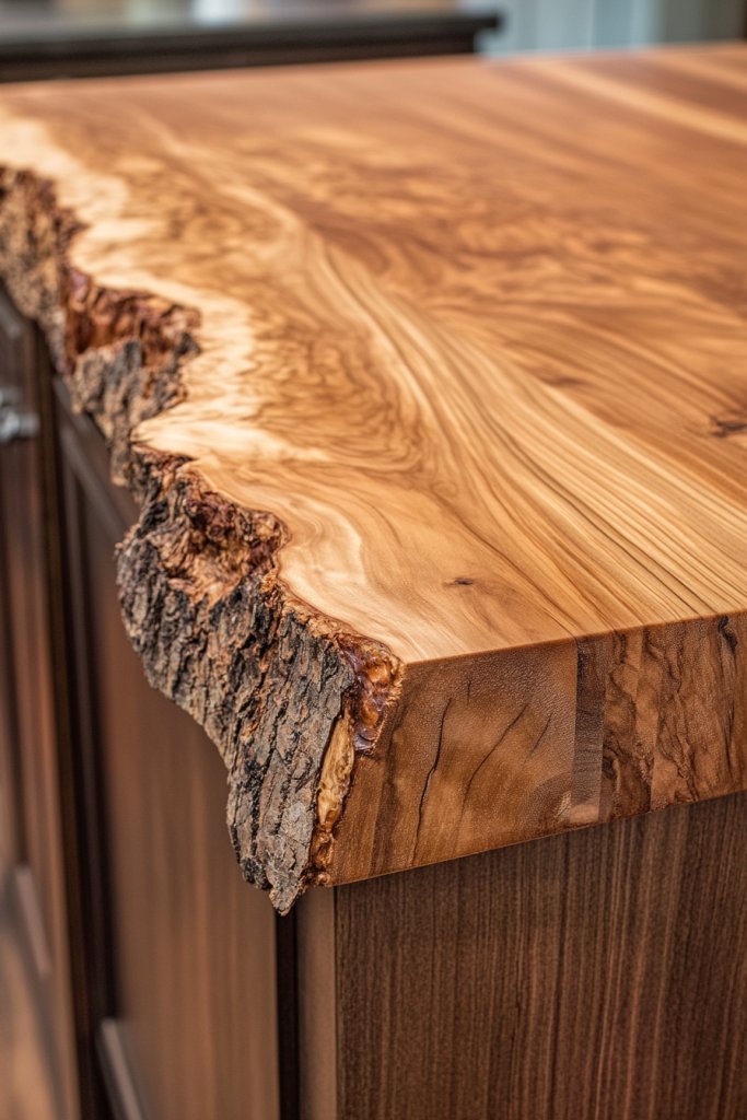 Live-edge countertops work well in open-plan kitchens or rustic cabins, but can also add charm to modern spaces when paired with sleek cabinetry. You can choose lighter woods like maple or oak for a subtle effect or go bold with darker woods like walnut for drama. To keep the look balanced, pair it with minimalist hardware or open shelving. For seasonal variations, layer with cozy textiles or vintage accessories that echo the natural theme.