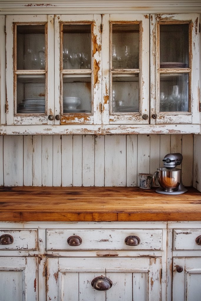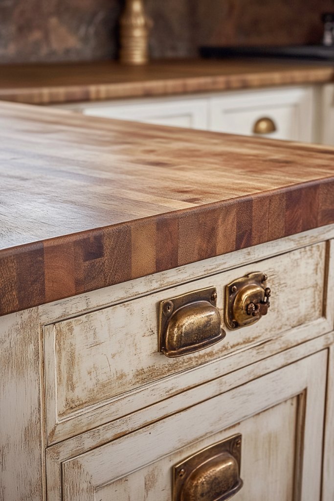 Choose cabinets with a distressed or whitewashed finish, or paint and sand existing ones for a custom look. Seal the paint with a matte or satin topcoat to protect against wear. Pair with a warm butcher block surface sealed with oil or polyurethane. During installation, ensure proper leveling and secure attachment. For a cohesive look, match hardware and accents accordingly.