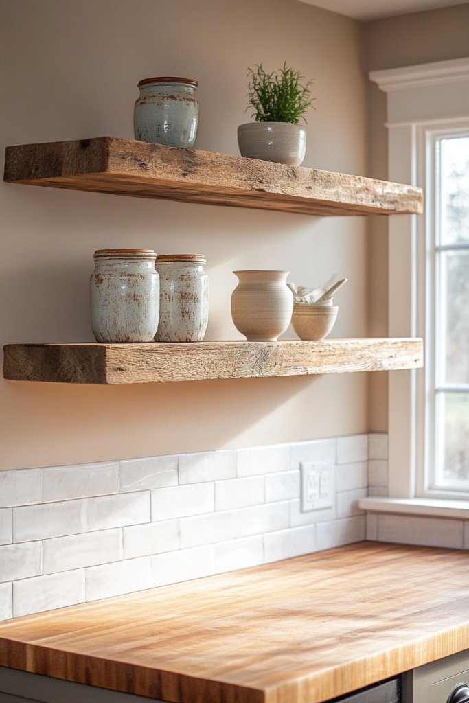 Picture sleek wooden shelves mounted against a painted wall, displaying a curated collection of bowls, jars, and utensils. The natural wood tones tie beautifully with butcher block countertops, creating a seamless rustic look. The open design allows light to flow freely, making the space feel larger and more inviting. It’s like turning your kitchen into a functional gallery.