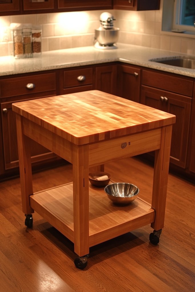 Visualize a sturdy wooden island with a warm, honey-toned butcher block surface. It’s topped with a few decorative bowls, a cutting board, and some fresh produce, creating a lively, inviting scene. The island’s base can be painted in a contrasting color or left natural for a rustic feel. Its presence anchors the room, making it feel both practical and cozy. It’s like having a custom-made chef’s station right in your kitchen.