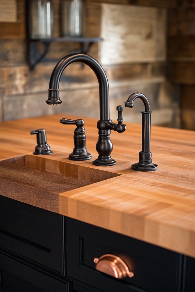 Looking to add a modern edge to your rustic kitchen? Matte black or copper accents balance warm wood tones with industrial or vintage chic. These finishes create visual contrast that elevates your space beyond basic rustic. Want to make your countertops pop without overwhelming the charm? This is the subtle upgrade you need.