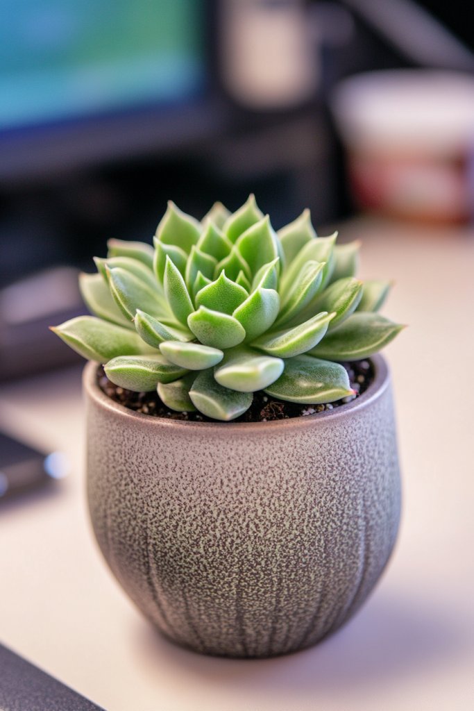 Visualize sleek ceramic or matte-finish planters in monochrome or metallic hues, housing tiny succulents or cacti. These plants sit on your desk or shelf, adding a fresh vibe without clutter. Their simple, sculptural forms complement contemporary decor, providing a natural contrast to tech gadgets and stationary.