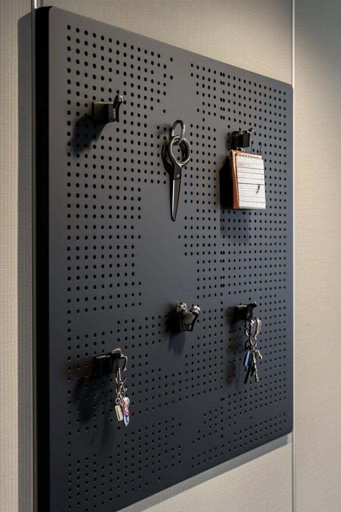 Imagine a matte black or white pegboard mounted neatly on your cubicle wall. You hang small baskets, hooks, or shelves holding supplies, personal items, or decorative accents. The arrangement creates a modern grid-like pattern, with some pegs left empty for future additions. Textured elements like rope or leather straps add depth, making the setup visually engaging.