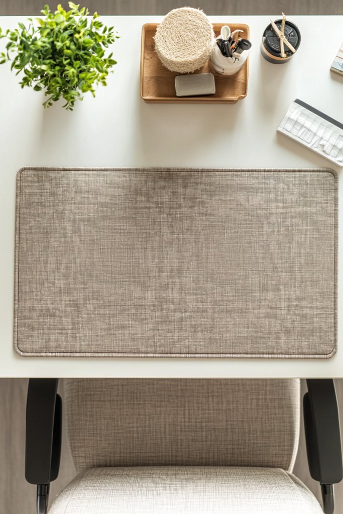 Imagine a faux leather or cork desk pad in a trendy pattern—perhaps a marble print or bold geometric design. It defines your workspace area while adding texture and visual interest. The soft surface feels luxurious under your hands, and the contrasting edge stitching adds a polished touch. It’s a chic upgrade that makes your desk inviting.