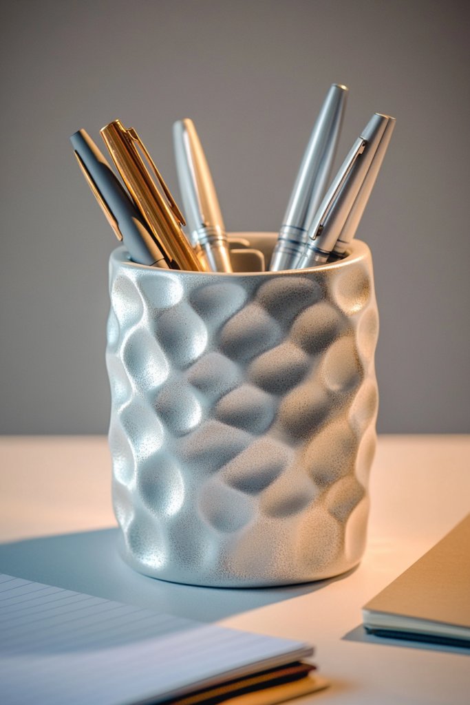 Visualize a marble or geometric metal pen holder sitting proudly on your desk. The sleek finish and sculptural shape draw attention, turning a simple item into a statement. Brightly colored ceramic containers add vibrancy, and textured concrete holders lend an industrial feel. These containers make your workspace feel curated and intentional.