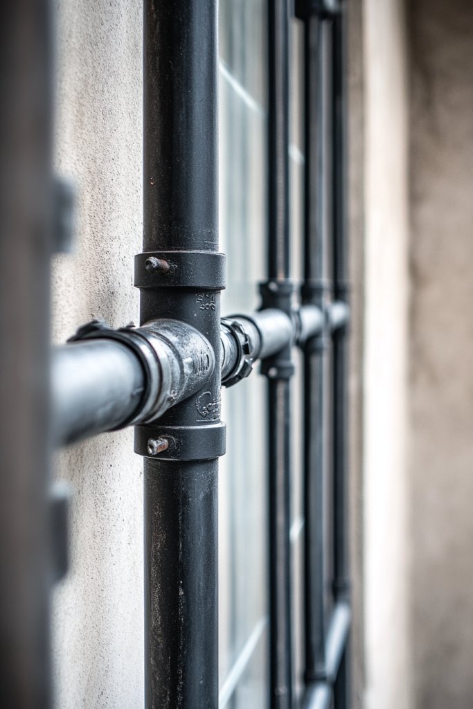 Picture slim black or matte gray pipes forming a clean, geometric border around your window. The pipes’ simple lines and exposed fittings give an industrial feel, while the overall frame adds structure. The contrast between the metallic finish and warm, textured surroundings creates visual tension that’s both modern and rustic. It’s like combining the best of both worlds.