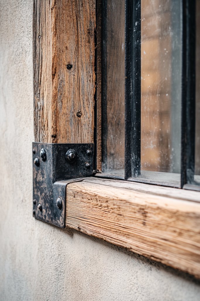 Source reclaimed metal panels or strips, making sure they are treated for rust resistance if needed. Measure your window carefully and cut the metal to size with appropriate tools. Attach the metal accents using heavy-duty screws or rivets, ensuring they are secure and level. Install the wooden border flush against the metal, attaching with nails or adhesive. Finish with a protective coating on the metal to prevent further corrosion.
