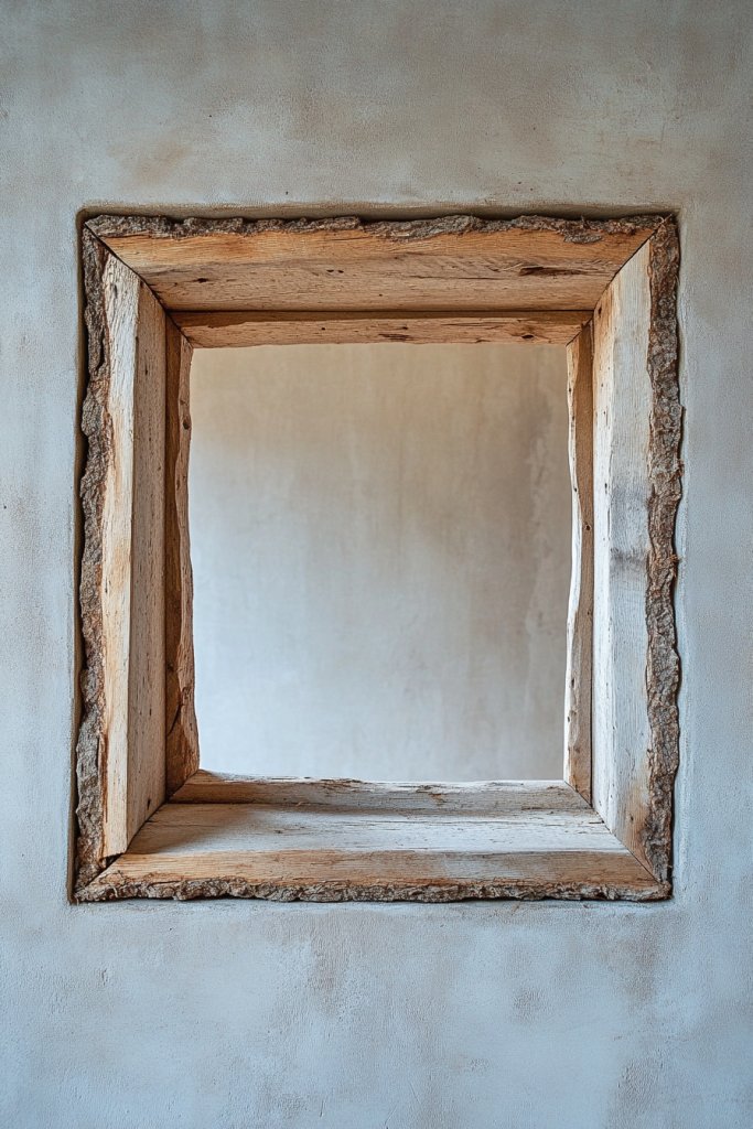 Visualize a natural, untreated wood frame with visible knots and grain patterns. The unpolished surface emphasizes authenticity, allowing the natural textures to take center stage. The subtle variations in color and pattern create visual depth without adding clutter. It’s like framing your window with a piece of nature itself, raw and unfiltered.