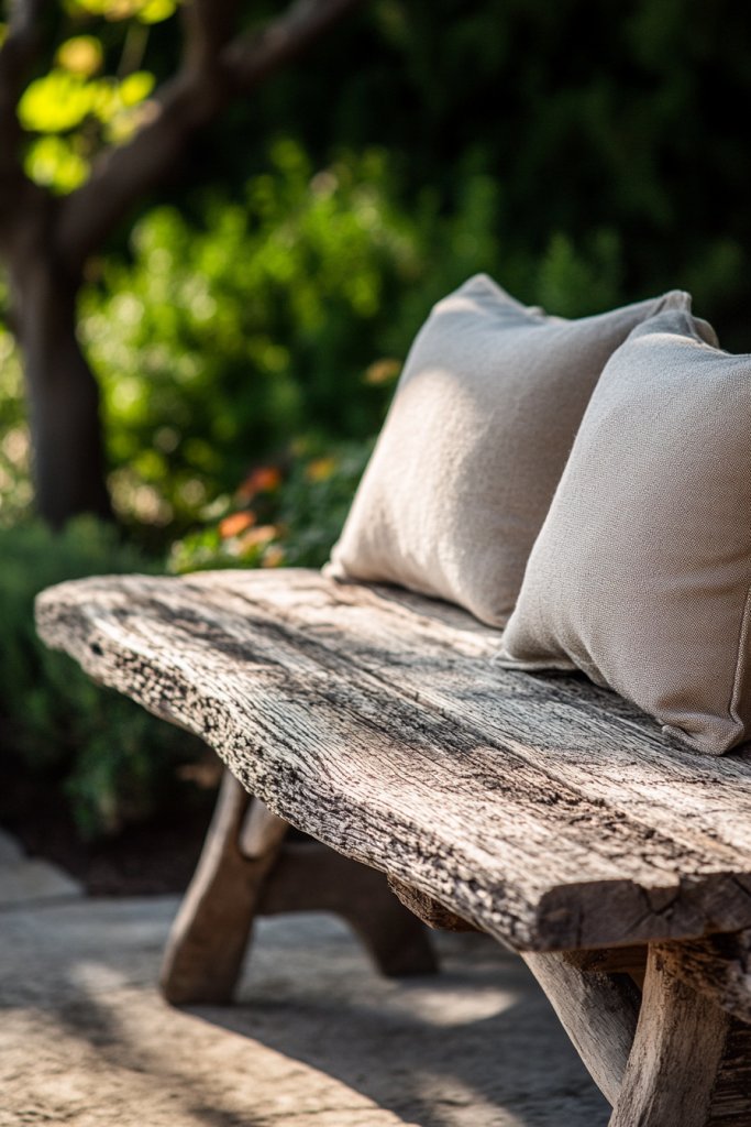 Picture a weathered wooden bench with a rough-hewn finish, softened by plush, neutral-toned cushions. Imagine sitting there on a sunny afternoon, the texture of the aged wood contrasting beautifully with the smooth fabric of the pillows. It’s the perfect blend of rustic authenticity and comfort, making your patio feel like a countryside retreat. The natural grain and knots in the wood add visual interest and personality.