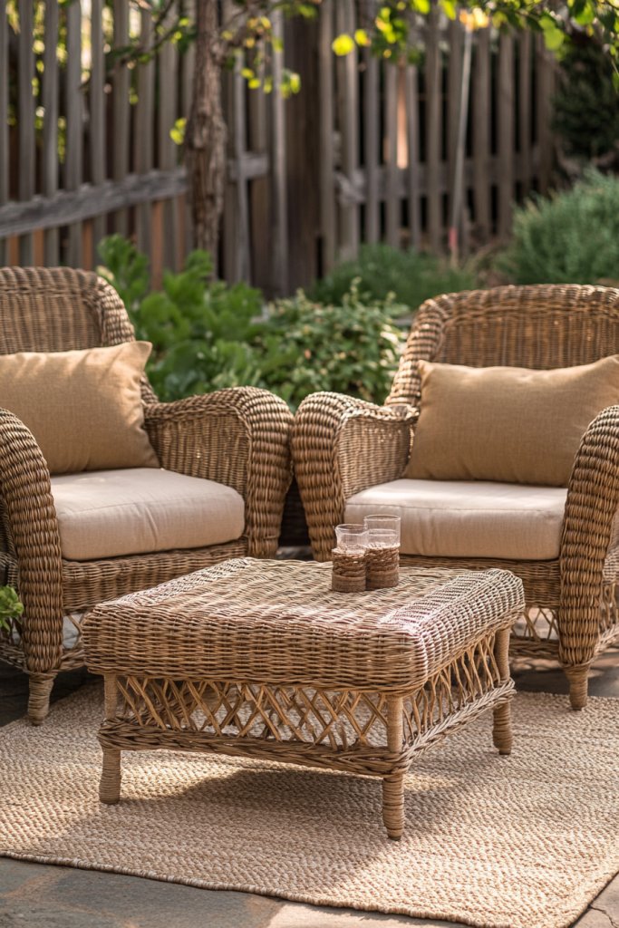 Select high-quality wicker or rattan furniture designed for outdoor use. Regularly clean with a soft brush and mild soap to remove dirt. Protect with furniture covers during harsh weather or bring pieces inside during winter. Arrange around a central fire pit or under a pergola for maximum effect. Mix and match different pieces—chairs, loveseats, and ottomans—to create a versatile lounging area. Consider adding a weather-resistant outdoor rug underneath for extra comfort.