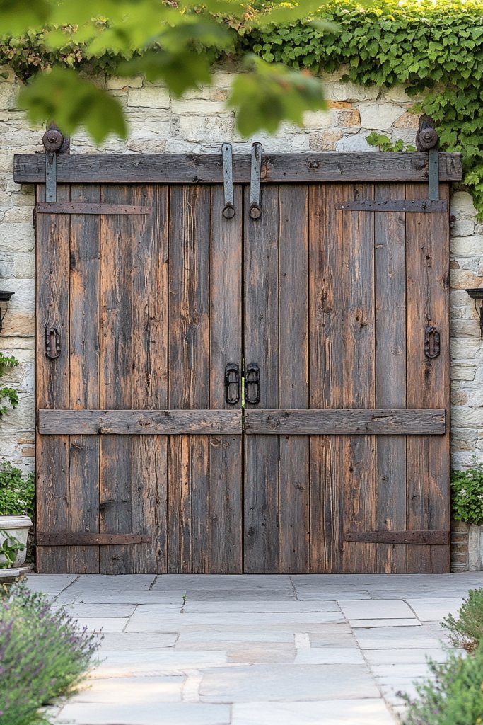 Source barn doors from salvage yards, antique shops, or repurpose old ones. Install heavy-duty hardware and secure the door to a sturdy frame or wall. Ensure proper clearance for sliding or swinging. Treat the wood with weatherproofing sealant or paint to withstand outdoor conditions. Position it where it naturally divides your space, and add hardware like handles or latches to complete the look.
