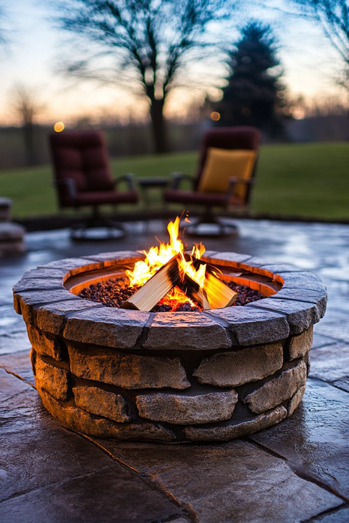 Picture a circular fire pit built from stacked natural stone or repurposed metal, surrounded by mismatched wooden chairs or benches. The flickering flames cast a golden glow, illuminating the rustic textures of the stone and wood. String lights overhead add a soft ambiance, while the smoky aroma of wood sparks memories of countryside evenings. It’s a scene that beckons you to unwind and connect.
