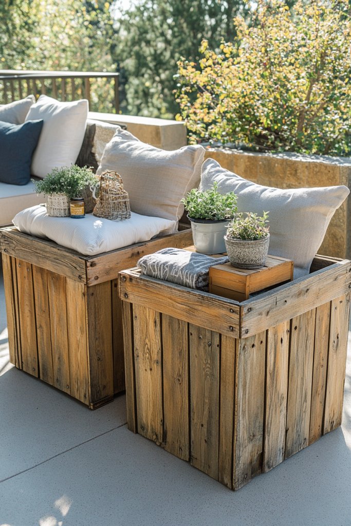 Source large wooden crates from antique markets, craft stores, or repurpose shipping pallets. Sand rough edges and seal the wood with weatherproof stain or paint. Arrange crates in clusters or use them individually for different functions. Secure them to prevent tipping over or stacking securely for stability. Fill with appropriate items—cushions, tools, or plants—and arrange for easy access.