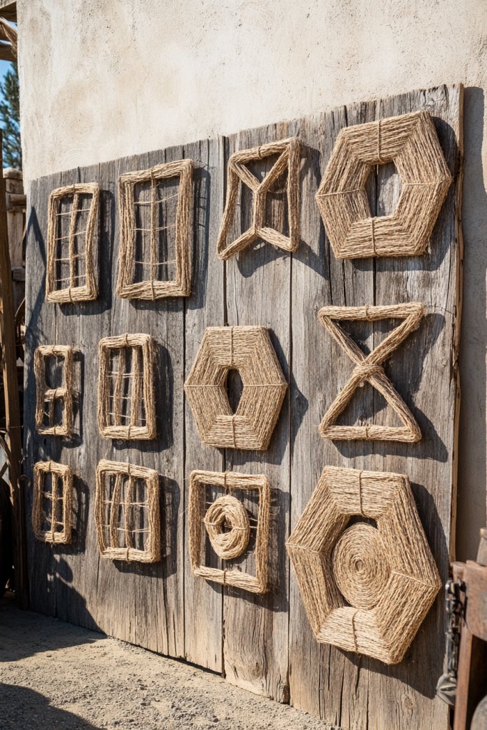 Imagine a large wooden plank or canvas adorned with intricate shapes or farm-inspired words, all outlined with twine or rope. The texture of the rope adds depth and dimension, catching the light in interesting ways. Hang your creations on a weathered fence or barn door to add a personal, artistic element to your outdoor space. It’s a charming, DIY gallery of your own making.