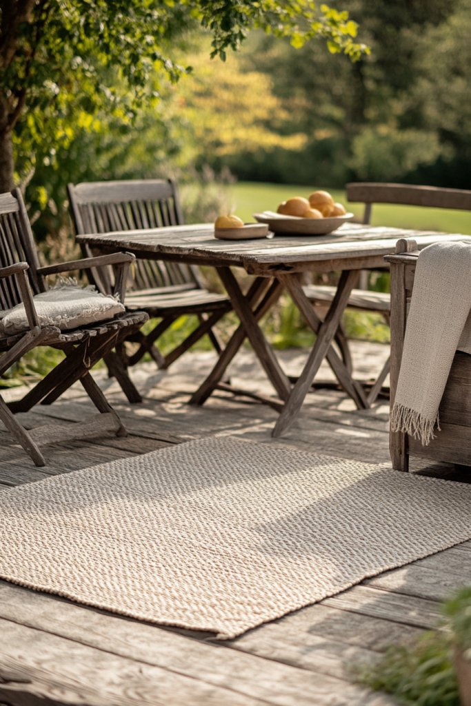Visualize a large, textured woven rug in shades of beige, gray, or taupe laid beneath a rustic table and mismatched chairs. The natural fibers add a tactile element that contrasts beautifully with stone or wooden decking. During a lazy afternoon, the rug cushions your steps and adds a layer of softness to the outdoor environment. Its neutral tone makes it easy to coordinate with seasonal decor.