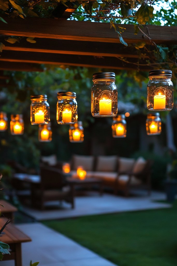 Imagine hanging rows of glass jars filled with flickering candles or LED lights along your pergola or tree branches. The jars catch the light beautifully, casting a gentle glow that dances across your patio. The rustic charm of the Mason jars pairs perfectly with string lights, creating a whimsical, vintage-inspired scene. It feels like a secret garden come to life.