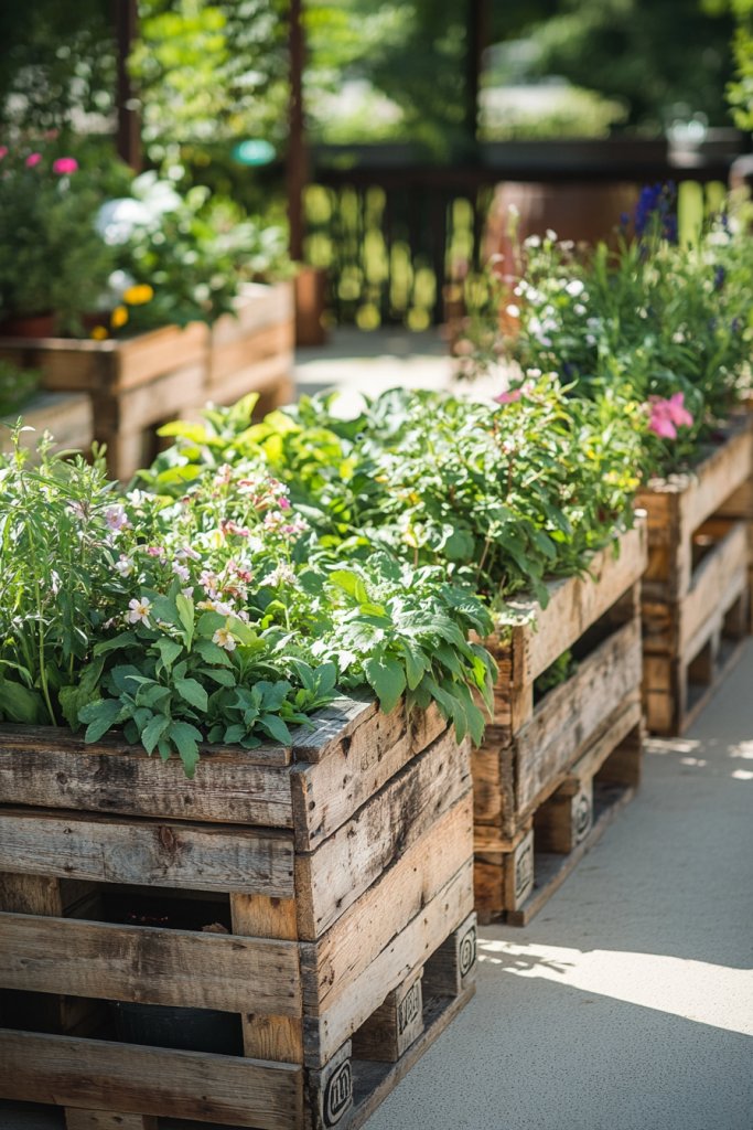 Envision a wooden pallet transformed into a charming planter box, with vibrant blooms spilling over the sides. The rough-hewn wood contrasts nicely with lush greenery, creating a layered, textured look. Place several along the edge of your patio or hang them on a fence for added visual interest. The rustic finish and simple design evoke a countryside feel that’s both inviting and authentic.