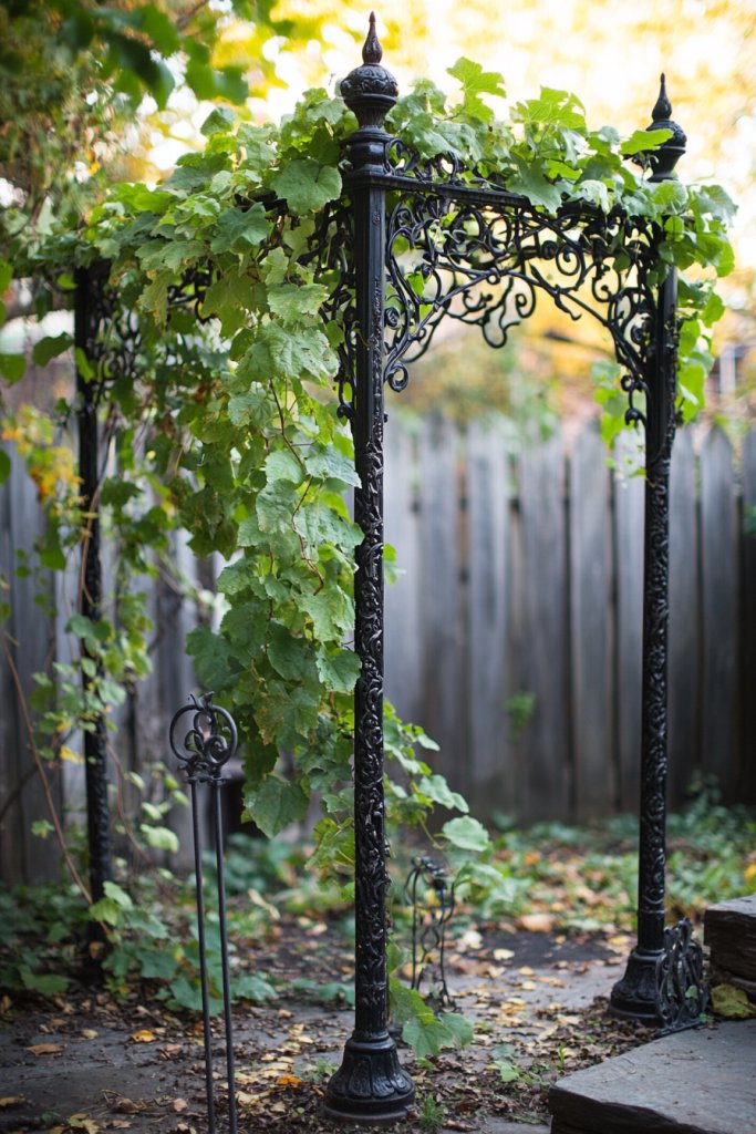 Imagine a delicate wrought iron trellis entwined with trailing greenery or flowering vines, set against a weathered wooden fence. The ornate details catch the sunlight, casting intricate shadows on the patio surface. Small iron brackets or wall mounts add decorative flair, framing your space with a vintage, handcrafted vibe. It’s a subtle yet impactful way to enhance your outdoor aesthetic.