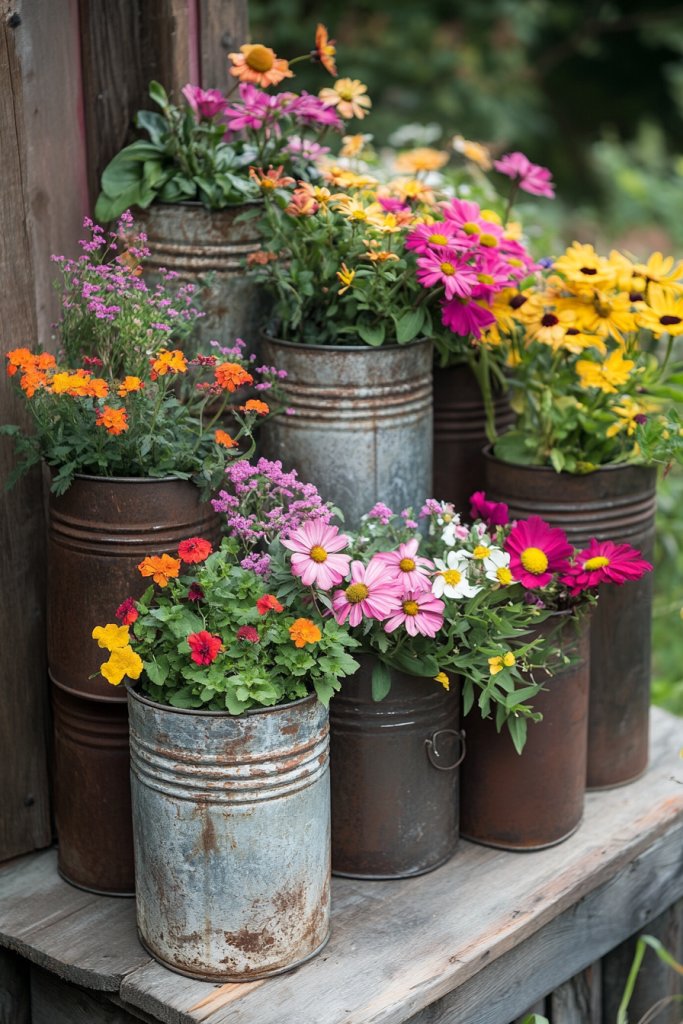 Paint the cans in muted tones to match your decor, or leave them in their natural patina for authentic appeal. Use them for seasonal displays—poinsettias for winter, sunflowers for summer. Stack or group different sizes for visual interest, or add handles for portability. Pair with wooden crates or antique tools for a full farmhouse look.
