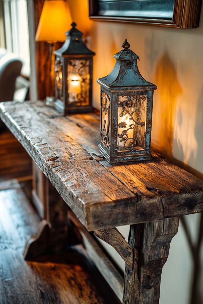 This idea works beautifully with various finishes—dark walnut, weathered gray, or even painted white for a shabby chic look. You can swap out lantern styles for metal sconces or add a distressed mirror above for extra charm. Seasonal touches like plaid throws or faux fur accents can refresh the look, while smaller vintage accessories personalize the setup. Even in smaller rooms, a slim console keeps the rustic appeal without overwhelming space.