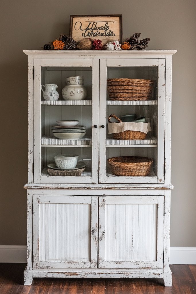 Imagine a distressed white or rustic wood cabinet with glass-paneled doors, revealing carefully arranged baskets, ceramics, or fabric-lined shelves. The transparent doors add a touch of elegance while protecting delicate items from dust. Decorate the top with seasonal accents or vintage signs, creating a layered, inviting look. The combination of open storage and glass showcases your farmhouse personality beautifully.