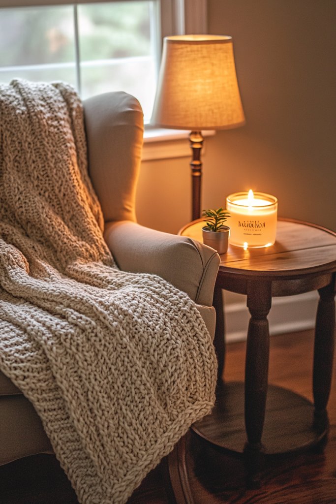 Choose a cozy chair or small bench and dress it with textured throws and pillows. Add a small side table and place a lantern or candle for ambient lighting. Decorate nearby walls with vintage signs, framed quotes, or small shelves for collectibles—avoiding restricted items. Use soft lighting options like battery-operated candles or LED lanterns for safety and convenience. Keep the space uncluttered, focusing on comfort and warmth.