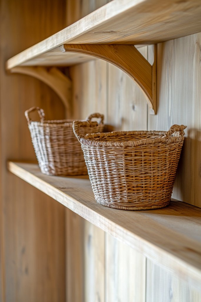 Picture sturdy wooden open shelves mounted on a painted or shiplapped wall, lined with neatly stacked books, decorative boxes, and vintage-inspired ceramics. Woven baskets sit underneath or beside, filled with blankets, magazines, or small accessories. The natural textures of the baskets contrast beautifully with the wood, creating a layered, inviting look. Soft, warm lighting from hidden fixtures highlights the arrangement, making the space feel cozy and organized.