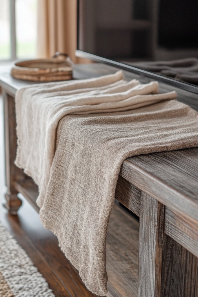 Imagine a chunky-knit or burlap runner draped across your TV stand or console, layered with softer linens like a linen cloth or a cozy plaid throw. Textured fabrics invite touch and create a sense of comfort. Combining different materials—rough burlap, soft cotton, and chunky knits—adds dimension and visual interest. Natural, earthy tones keep the look cohesive with farmhouse charm, while tactile layers make your space feel warm and lived-in.