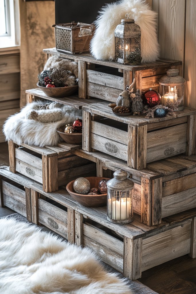 Envision stacked wooden crates arranged in a staggered formation, creating a multi-level stand. Top it with cozy decor such as faux fur throws, vintage bowls, or ceramic vases (though avoid vases if restricted). Add decorative accents like lanterns or seasonal ornaments to personalize the setup. The weathered, natural finish of the crates complements distressed furniture and textured textiles. This layered look feels warm, welcoming, and perfectly rustic.