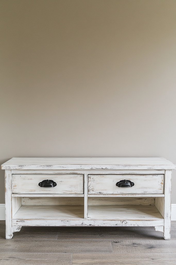 Picture a wooden TV stand painted in a soft, matte white with intentional distressing to reveal glimpses of natural wood underneath. Matte black handles or pulls add a striking contrast, emphasizing the vintage charm. The whitewashed surface softly reflects ambient light, making your space feel brighter and more open. The black hardware anchors the look, adding a touch of industrial edge that balances the rustic elements beautifully.