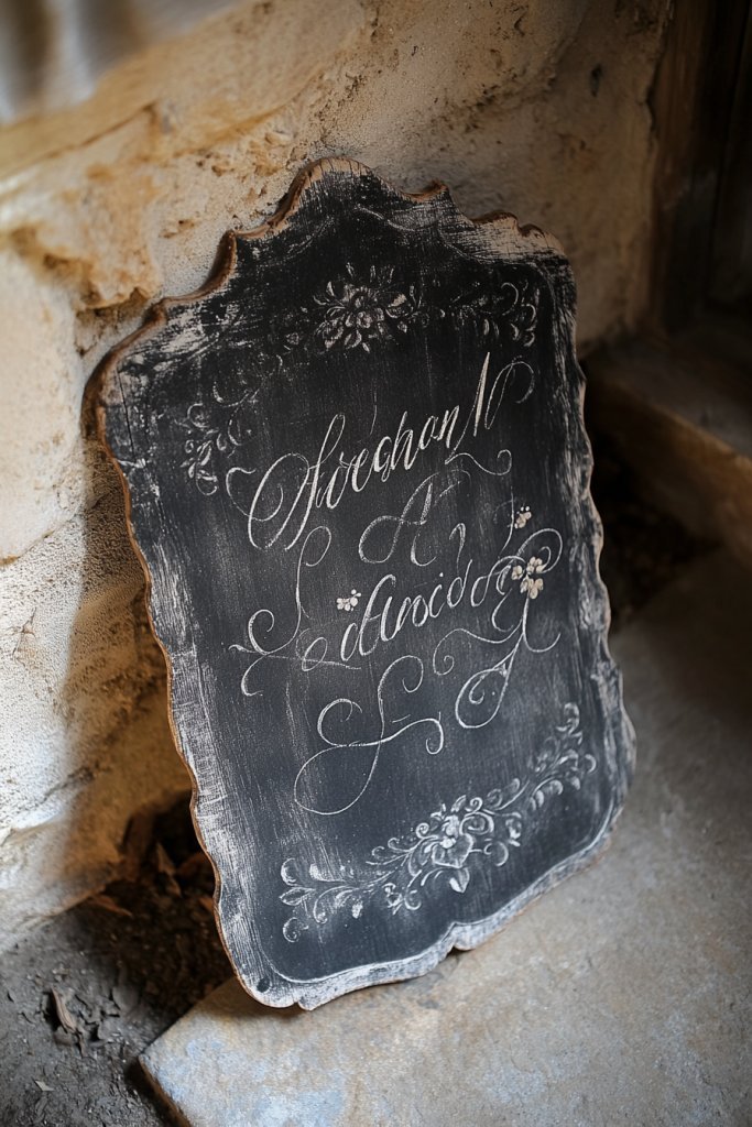 Picture a distressed wooden frame with a black chalkboard surface, leaning against a wall or mounted on a vintage wall bracket. Write a warm welcome or a seasonal message in elegant cursive, adding small decorative flourishes. Surround it with floral garlands or rustic accents, creating a focal point that invites conversation. The sign adds personality while blending seamlessly with French country decor.