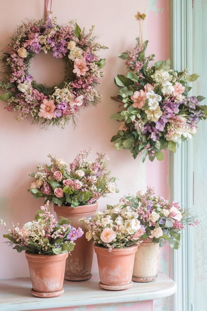 Visualize a bouquet of dried or silk florals arranged in a distressed terracotta pot or vintage enamel container. The muted, faded colors evoke a sense of history and nostalgia. Hang a faux wreath made of faux lavender or rattan around the door or wall, adding a layered, textured look. The combination creates a welcoming scene that’s both charming and effortless.