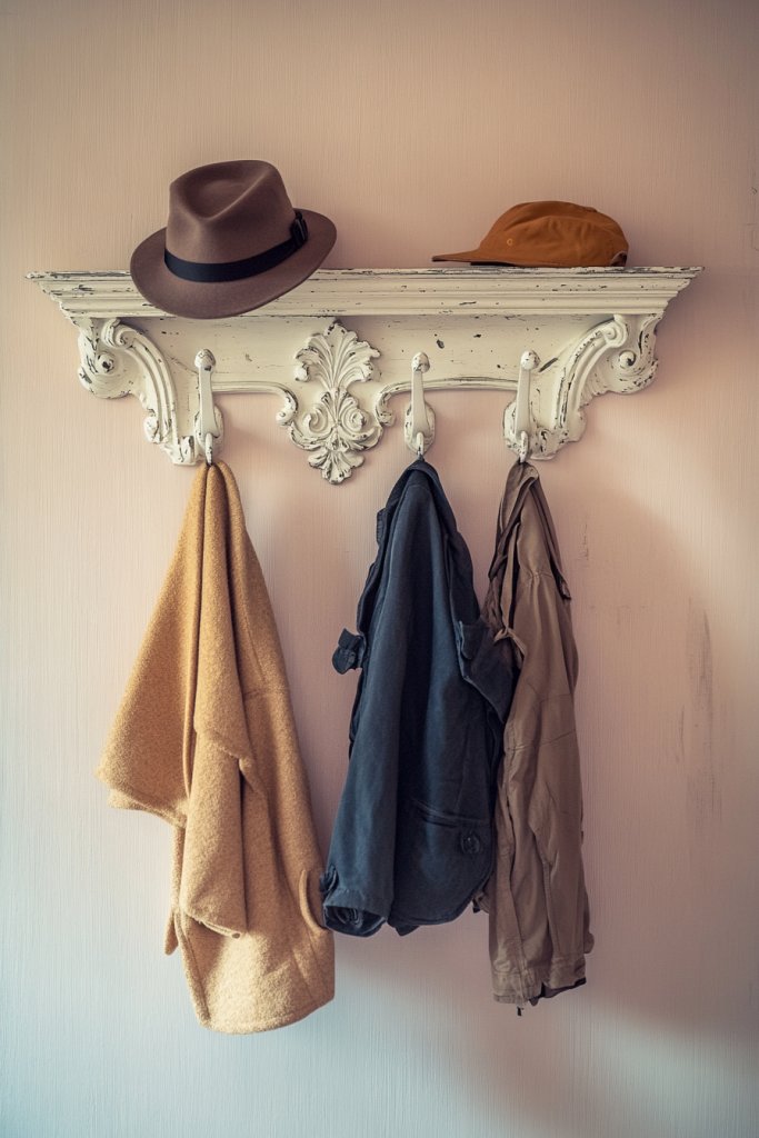 Imagine a vintage-inspired coat rack with a distressed white or pastel finish, featuring ornate hooks and decorative details. It’s mounted on a textured wall, with a few carefully hung coats, scarves, and hats that look curated rather than cluttered. The rack’s decorative flourishes add a layer of French elegance, making even a functional piece look like part of the decor.