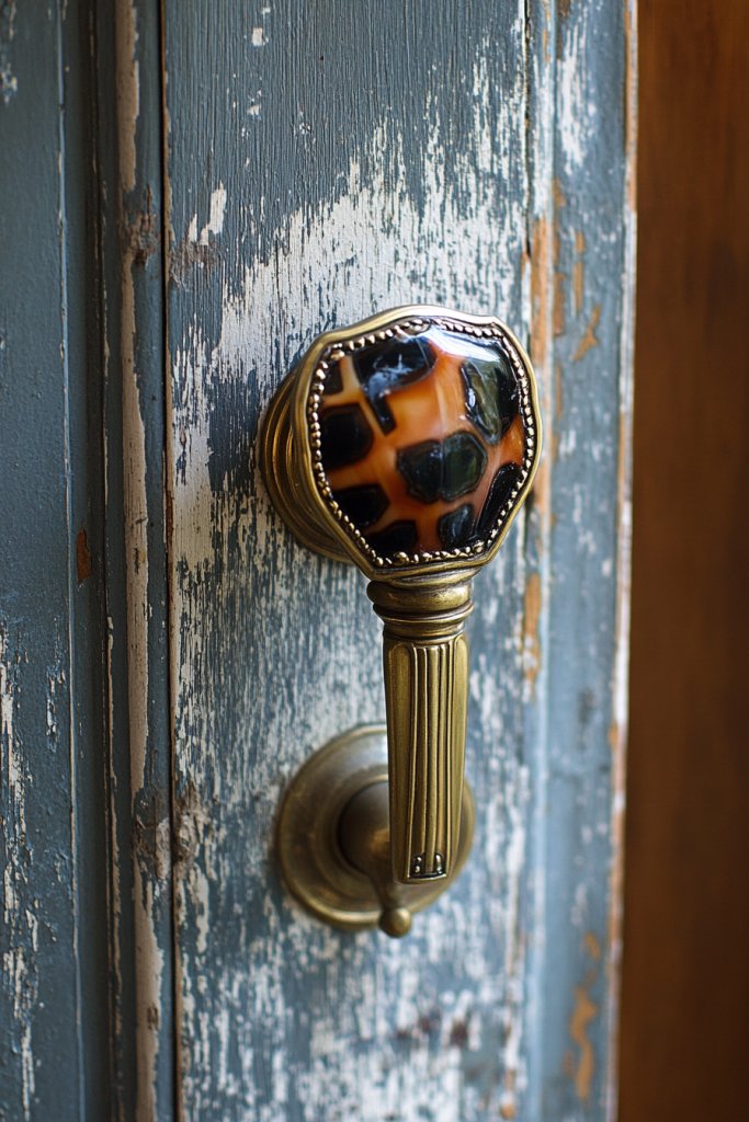 Imagine a sturdy, antique brass doorknob with intricate detailing catching the light. The warm, honey-toned tortoiseshell hardware complements painted or wooden doors, adding a subtle richness. These accents work beautifully against soft pastel walls or distressed finishes. The hardware’s vintage charm invites guests into a space that feels both timeless and refined.