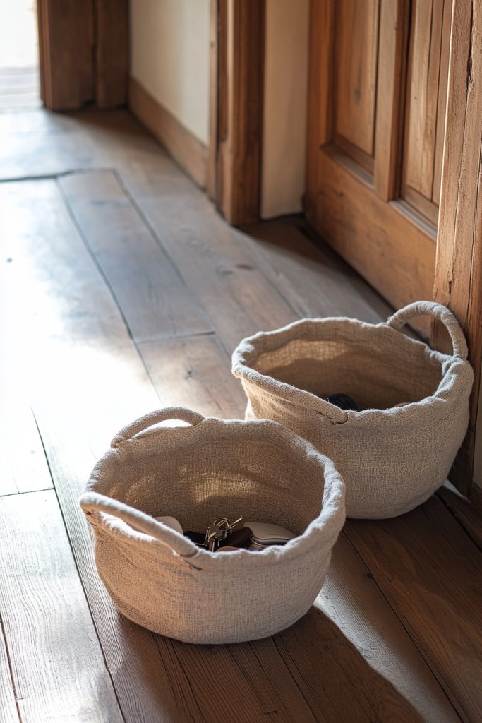 Clutter at your door driving you crazy? Linen or burlap baskets are a stylish solution that keeps things tidy while adding cozy texture. They’re perfect for storing shoes, scarves, or keys without sacrificing French country charm. Who says organization has to be boring?