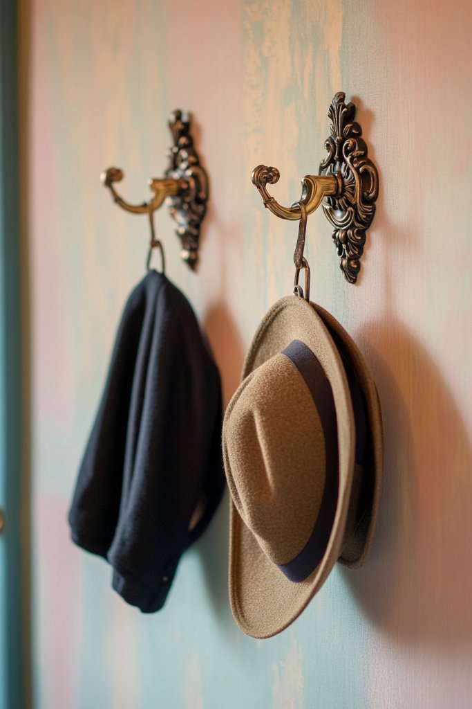 Tired of cluttered, chaotic entryways? Elegant wall-mounted coat hooks with decorative details offer a stylish solution. They’re both functional and charming, making organization feel like an art form. Who knew hooks could elevate your decor?