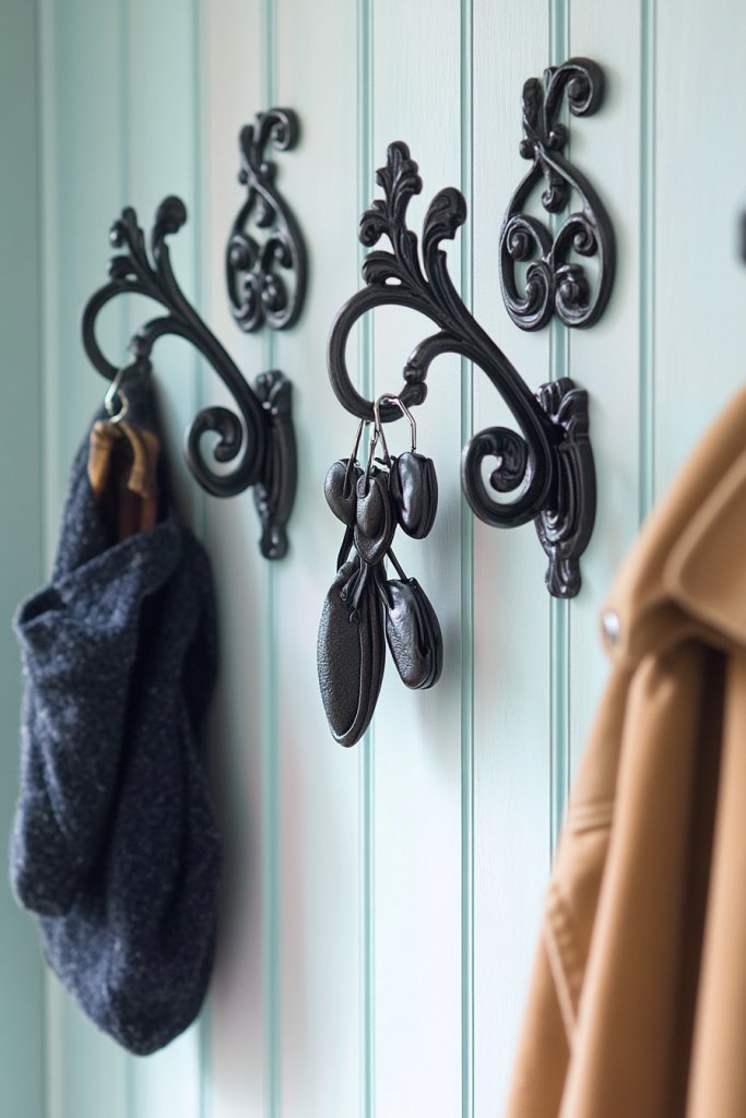 Picture ornate wrought iron hooks mounted on a textured, pastel-painted wall. The hooks feature delicate scrollwork and vintage-inspired details, adding a sense of old-world charm. Coats hang neatly without overwhelming the space, while decorative elements like a woven basket or a fabric tote sit nearby, completing the look. The metal’s matte finish contrasts beautifully with soft wall colors.