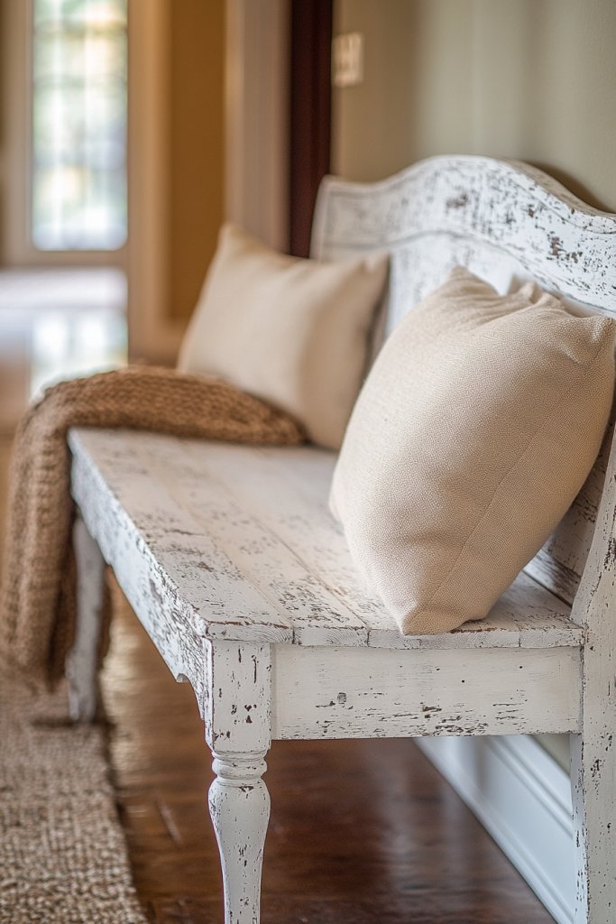 Picture a whitewashed wooden bench with a distressed finish, its paint chipped in places to reveal warm wood underneath. A neutral-toned cushion, perhaps in linen or burlap, invites you to sit and relax. The bench’s simple design pairs beautifully with vintage rugs and decorative pillows, creating a cozy nook that exudes French country charm. The soft, worn look makes it feel like it’s been part of the family for decades.