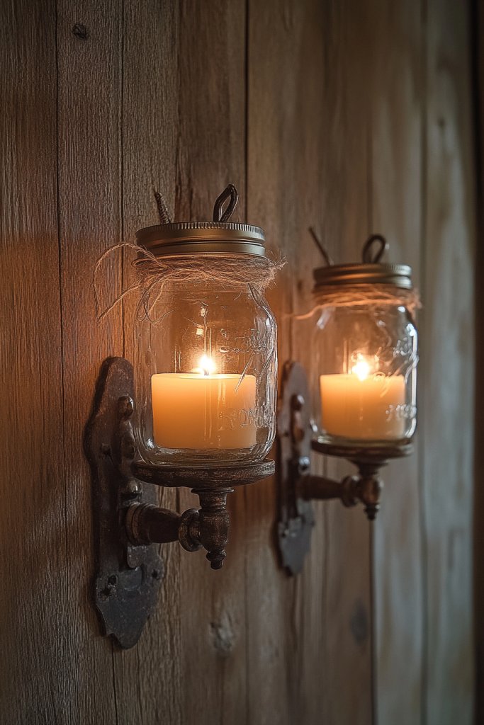 Imagine wall-mounted mason jars filled with tiny LED candles or string lights, casting a warm, flickering glow. The jars are hung with twine or metal brackets, adding a handcrafted feel. Surround the sconces with distressed wood or vintage metal accents to complete the look. The soft light creates a cozy nook that invites relaxation and charm.