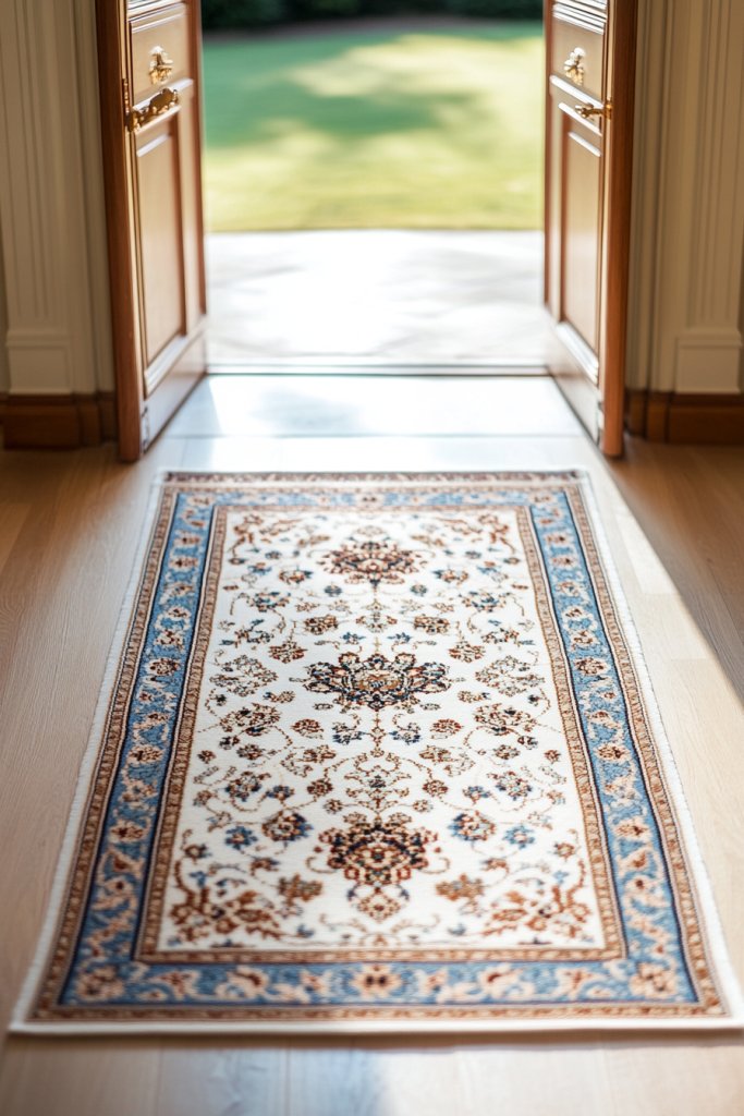 Select rugs with detailed patterns or simpler, more geometric motifs based on your style. For small entry mats, opt for a bordered design; for larger areas, go for full-sized rugs that cover most of the floor. Layer rugs for a more eclectic look or keep it simple for a streamlined feel. Choose color palettes that complement your wall and furniture tones.