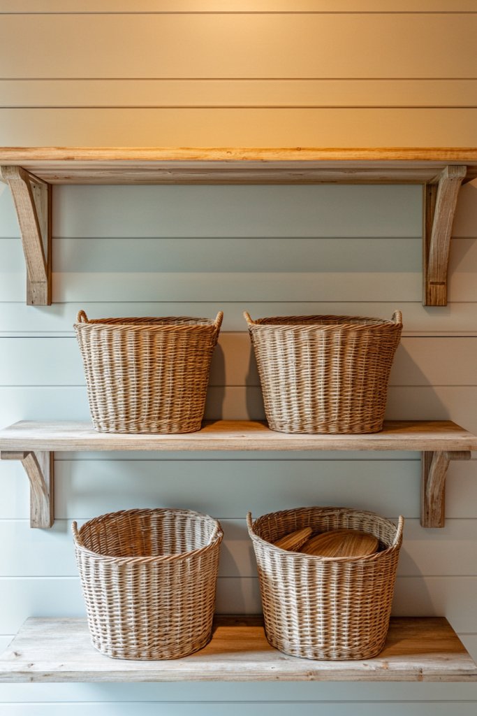Personalize baskets with painted or stenciled labels, or add decorative touches like ribbons or fabric wraps. Incorporate a small chalkboard or wooden plaque for notes and reminders. Mix in decorative textiles or vintage accessories on the shelves to add character. Keep the arrangement adaptable by swapping baskets or adjusting shelf heights seasonally.