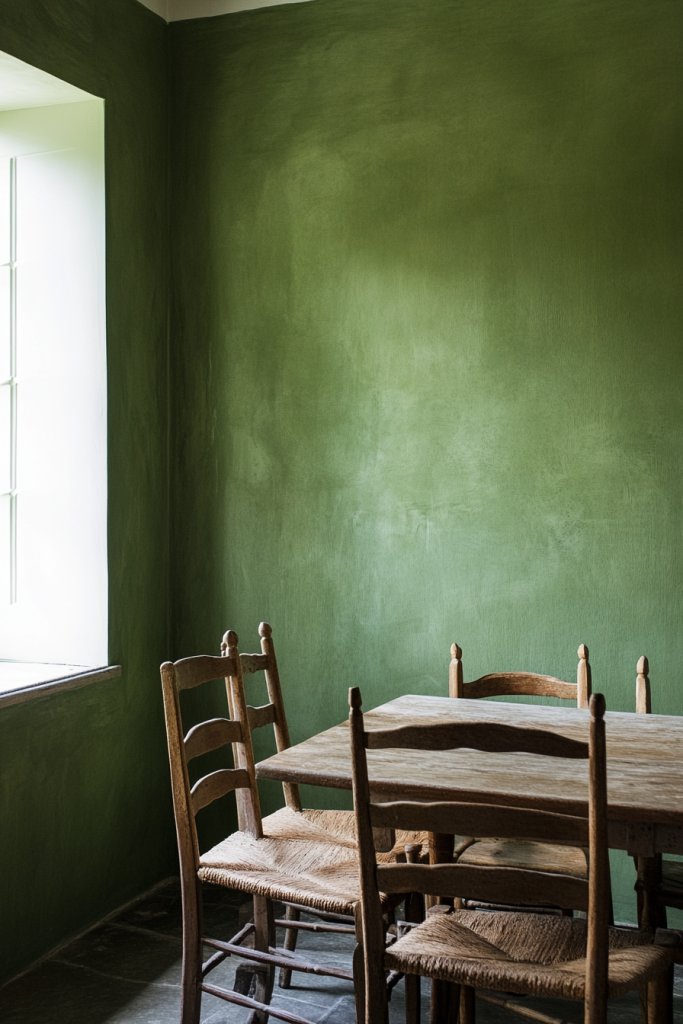 Imagine stepping into a dining room painted in soft sage, with natural light streaming in and bouncing off the walls, highlighting subtle color shifts. The textured walls have a matte finish, providing a gentle, soothing backdrop. Wooden accents and woven textiles complement the earthy tone, making everything feel unified and relaxed. It’s like bringing a piece of nature indoors, making every meal feel like an outdoor picnic.