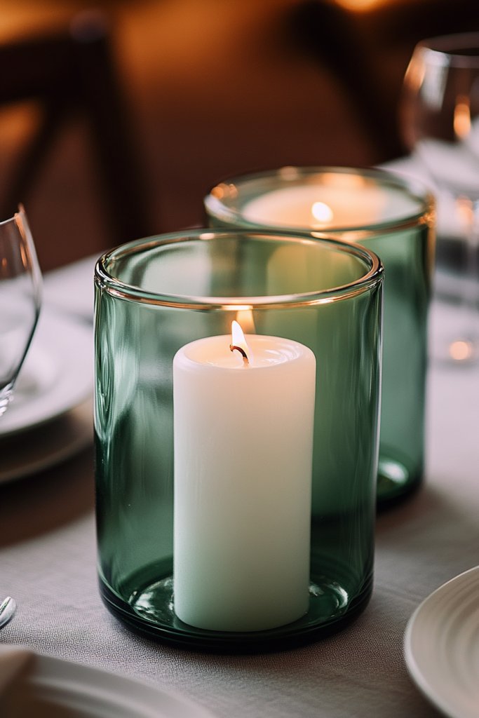 Imagine a cluster of green glass lanterns with flickering candles lining your table or hanging from hooks. The gentle glow casts warm, greenish hues that dance across the walls and tableware. The glass reflects the flickering light, adding a shimmering effect that enhances the cozy vibe. Small decorative details like textured candle holders or ornate lanterns add a layer of sophistication and charm.