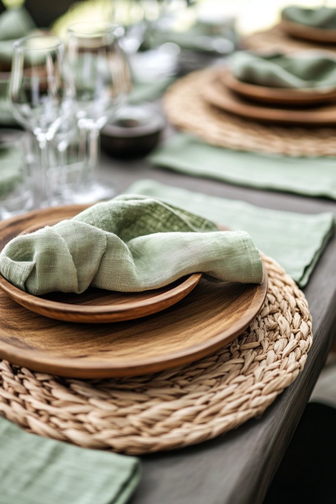 Imagine leaf-shaped coasters in soft ceramic resting under your glasses or small, textured green ceramic figurines placed along the table. Visualize natural fiber placemats or napkin rings, subtly tying everything together. These small details create a layered, textured look that feels organic and thoughtfully curated. They also add tactile interest, making every element on the table inviting.