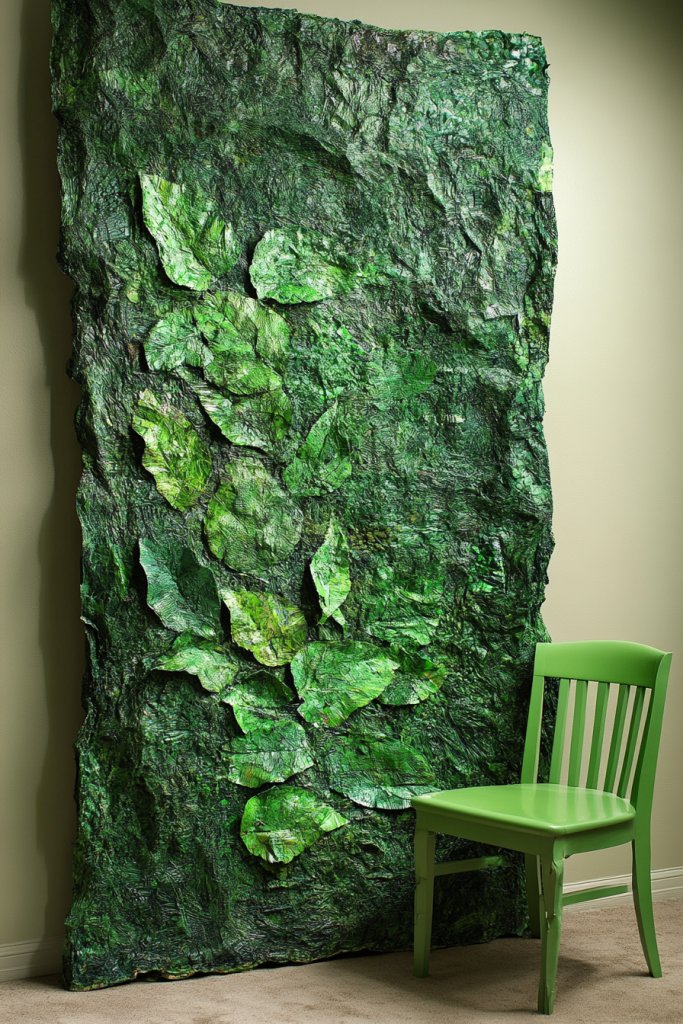 Imagine a sculpture crafted from reclaimed metal or a wall-mounted piece made from recycled wood, depicting leafy patterns or abstract nature scenes. Visualize a set of handcrafted prints featuring green landscapes or botanical motifs, printed on recycled paper. These elements create a layered, textured backdrop that reflects your love for the environment and art. The combination of textures and natural tones adds warmth and personality.