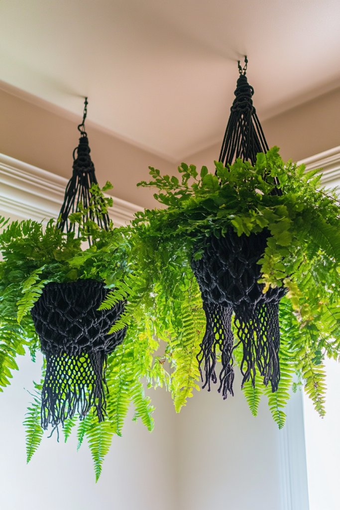 Picture intricate macramé hangers in natural cotton, suspended from ceiling hooks or wall-mounted brackets. Inside each, lush greenery trails down in soft, flowing fronds, adding movement and texture. The neutral tones of the macramé contrast beautifully with the vibrant greens of the plants. The effect is both artistic and lush, giving your room a layered, textured look that feels effortlessly chic. Ambient light filters through the fronds, casting gentle shadows.